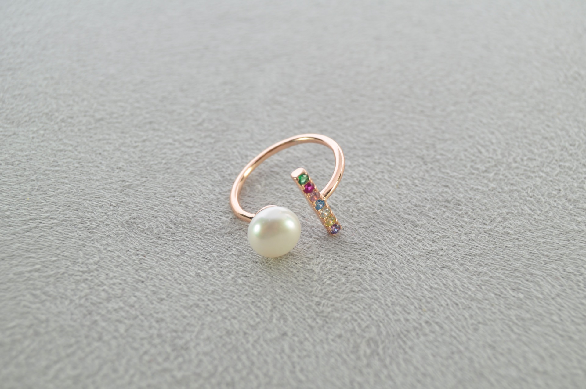 Anillo abierto con perla botón y siete circonita multicolor en plata de ley con baño de oro rosa