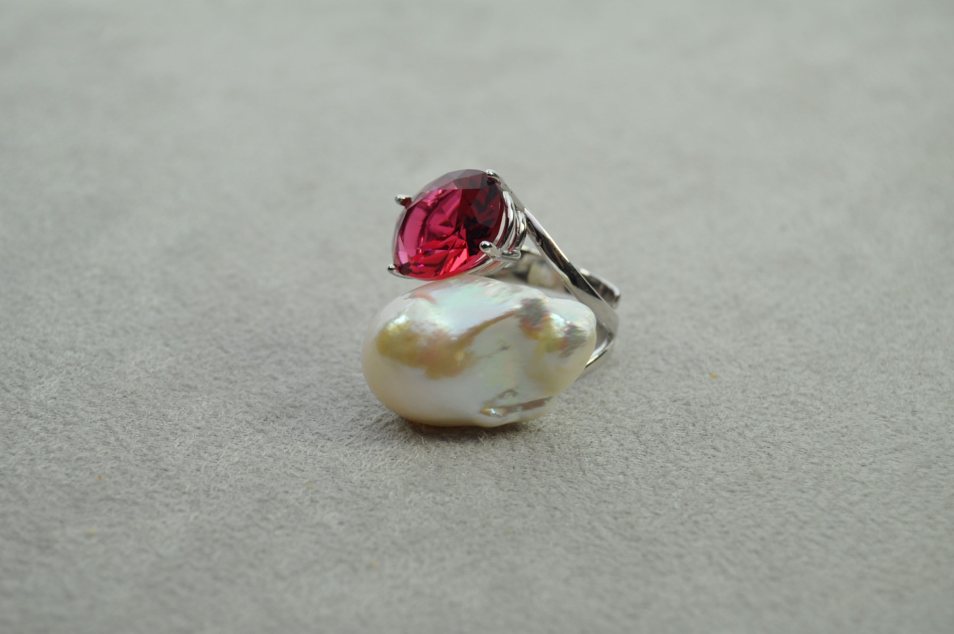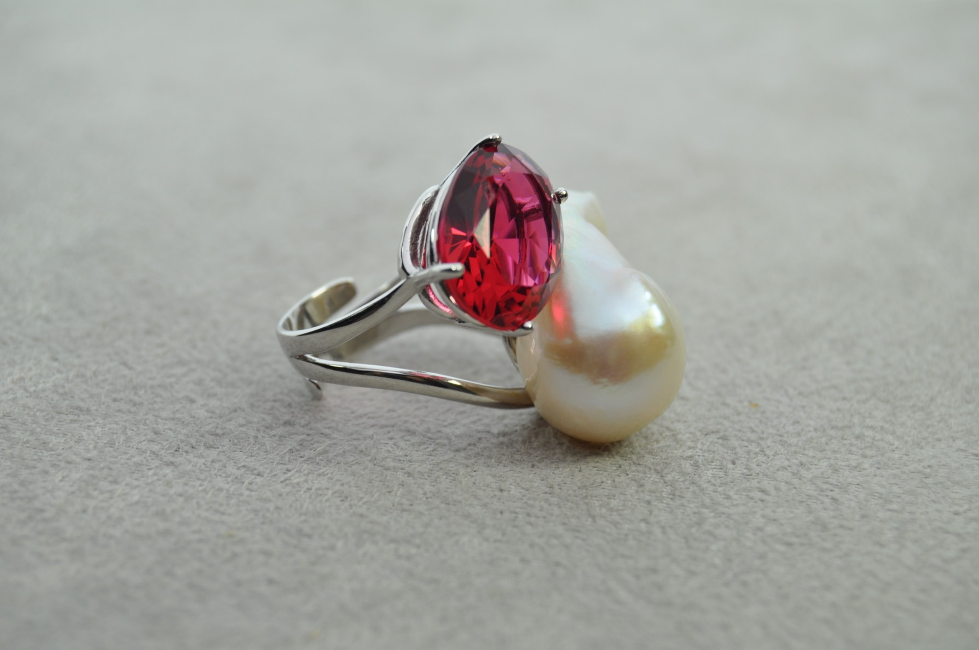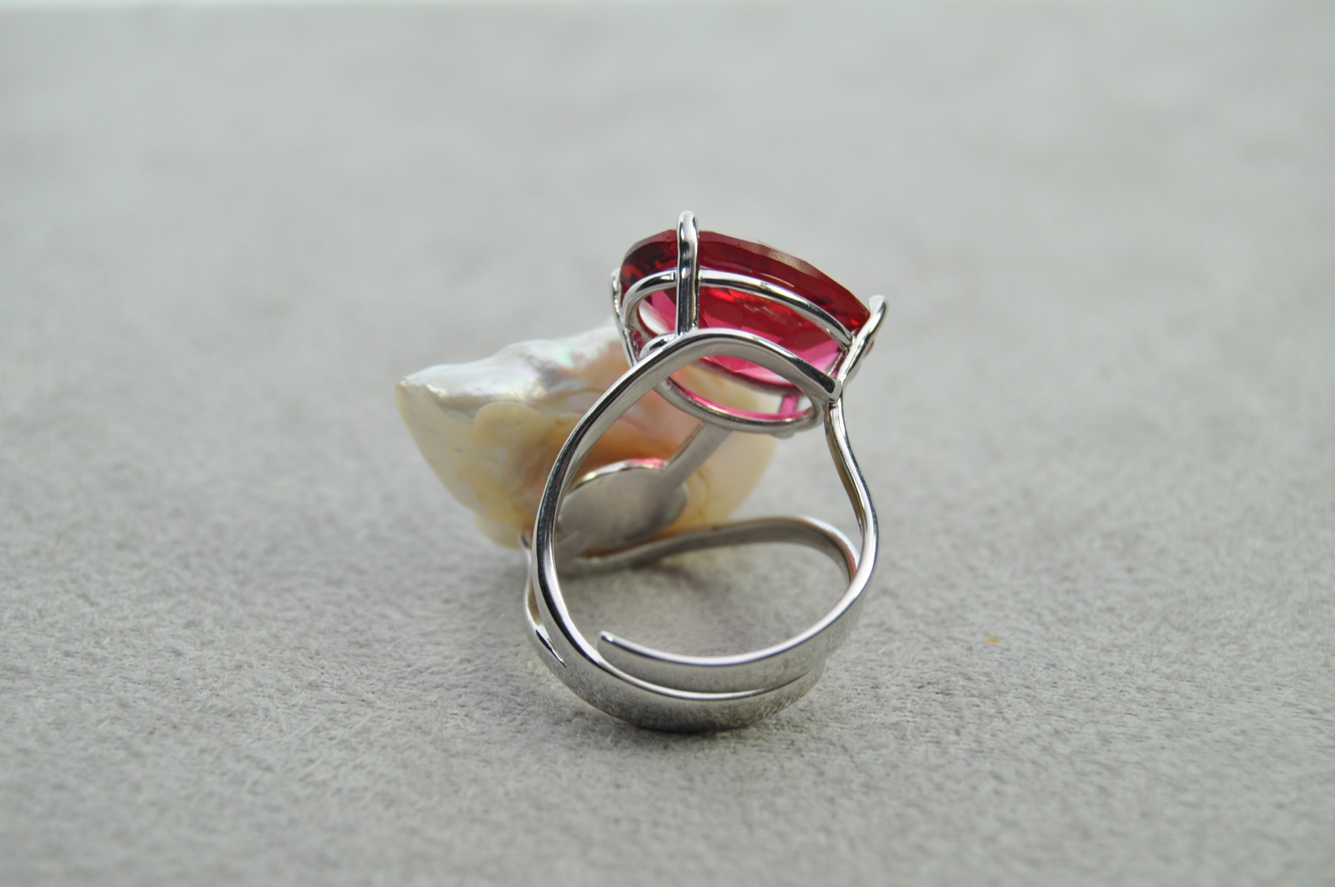 Anillo dos piezas con circonita rojo rubí y perla barroca engastado en plata de ley rodiada con brazo abierto.