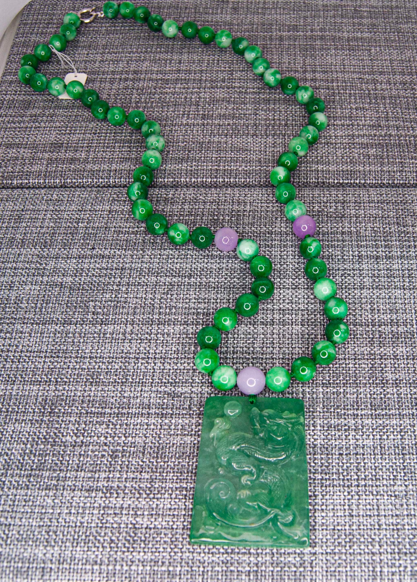 Collar de cuentas de jade y medallón 5x7 cuadrado con alegoría dragón protector y cierre marinero con un largo de 80cm