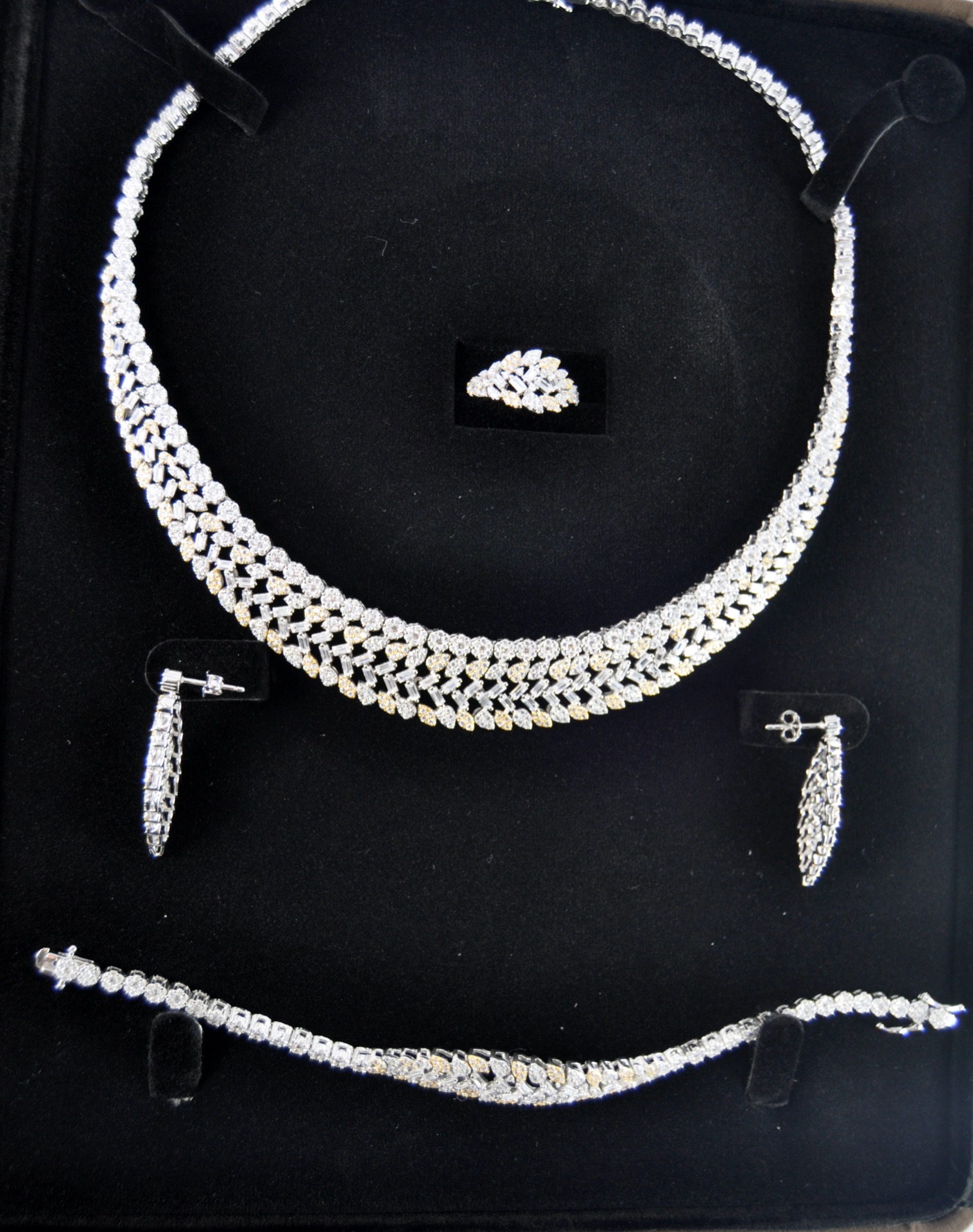 Con puesta de anillo, pendientes con cierre omega pulsera y collar en plata de ley engastado en circonita blancas y doradas, con estuche terciopelo chocolate