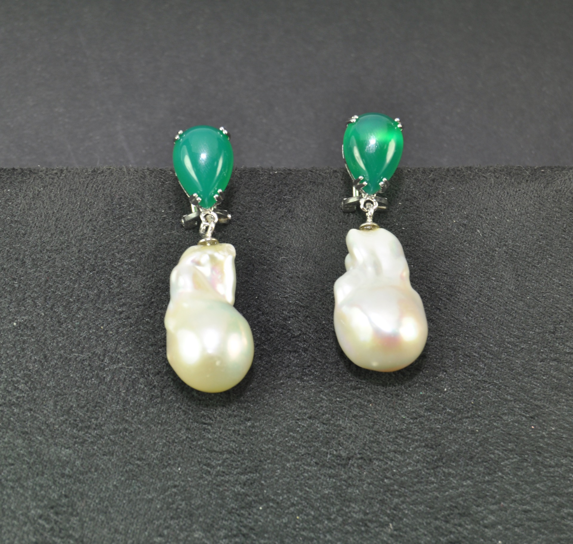 Pendiente de perla barroca extra engastado en plata de ley con ágata verde con un largo de 3,8 cm con cierre omega