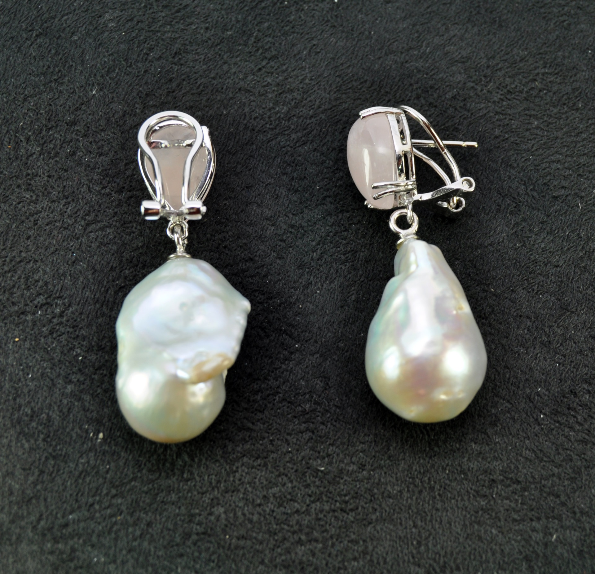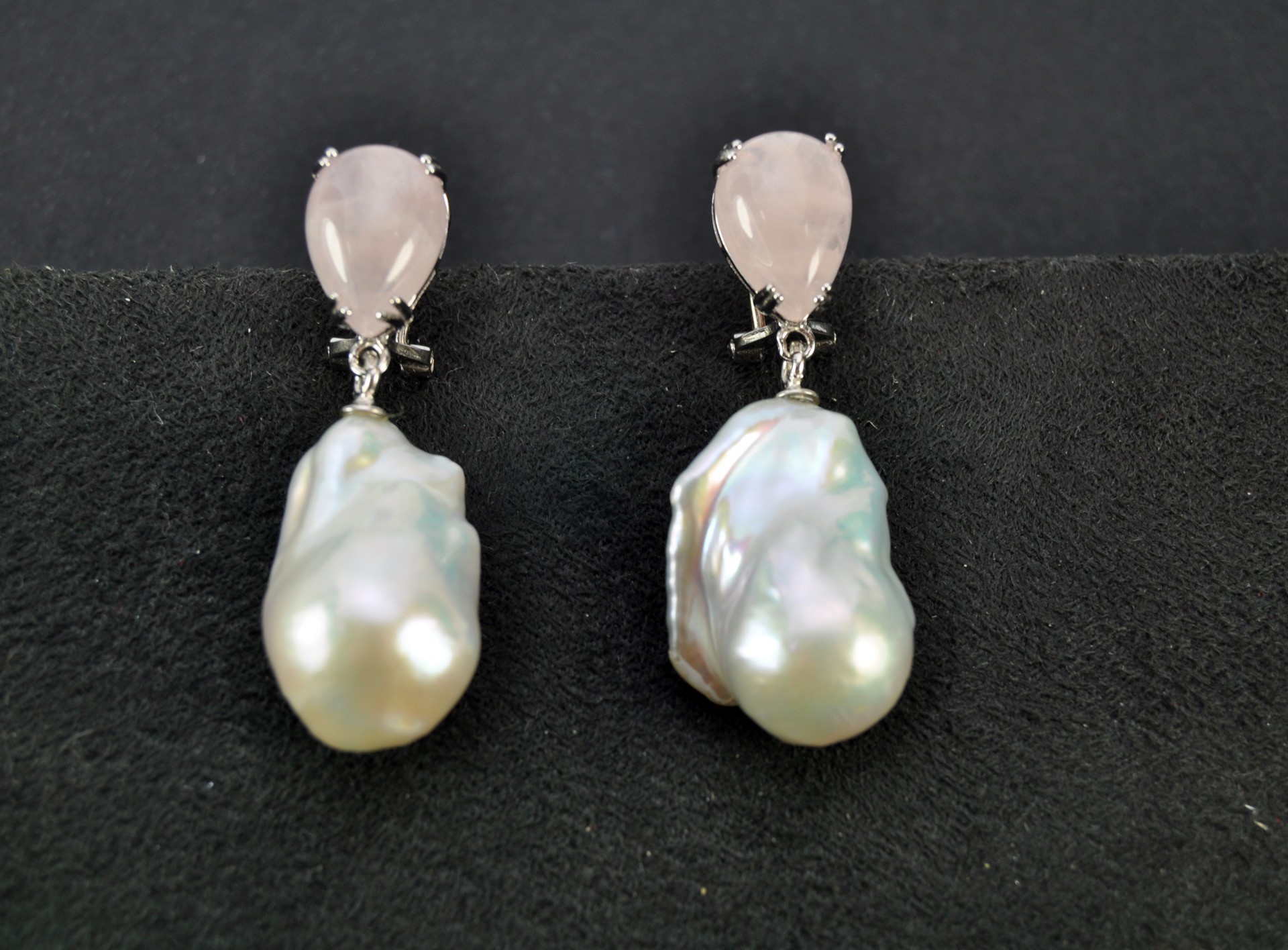 Pendiente de perla barroca extra engastado en plata de ley con cuarzo rosa un largo de 3,8 cm y cierre omega.