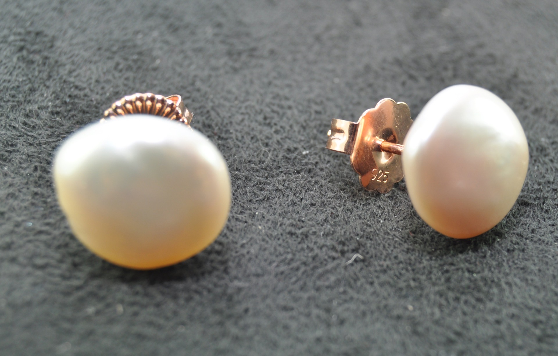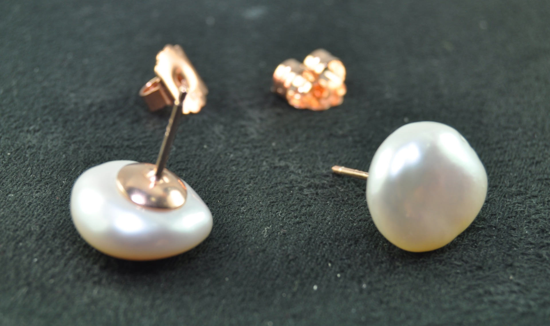 Pendiente con perla barroca engastado en plata de ley con baño de oro rosa y cierre a presión con un tamaño de la perla de 14mm