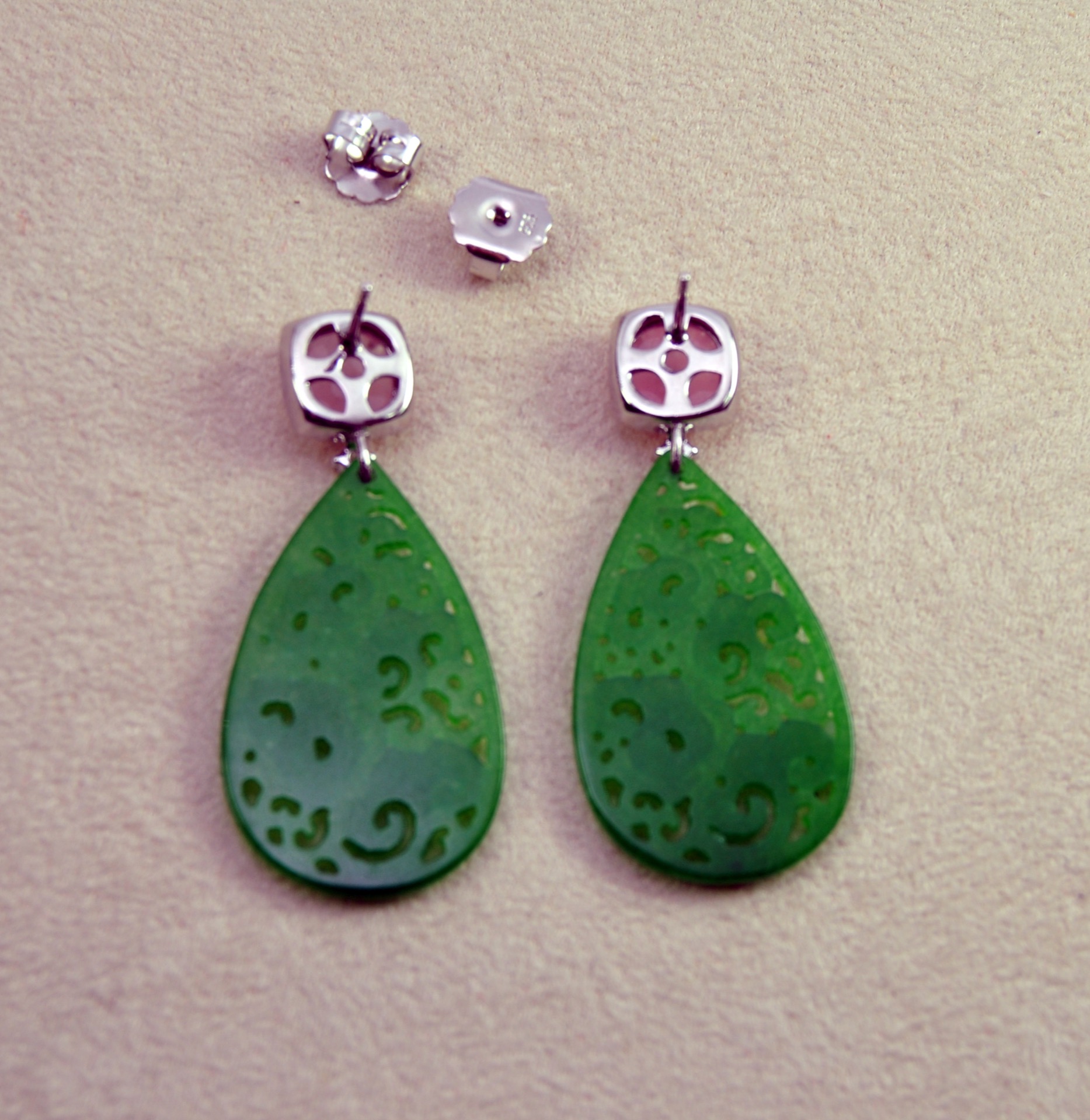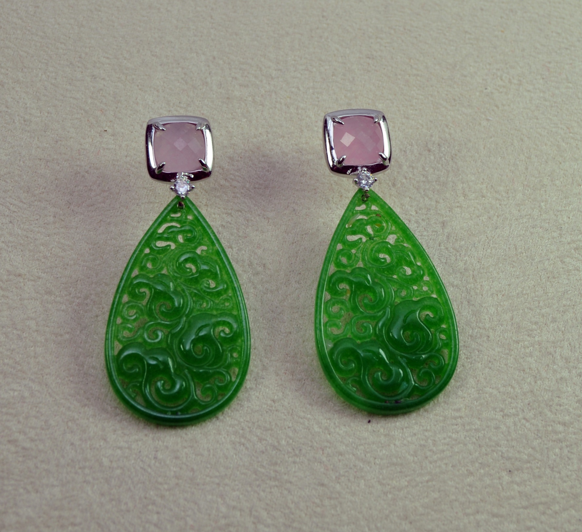 Pendiente de jade engastado en plata de ley y coronado con cuarzo rosa con un largo de 5cm