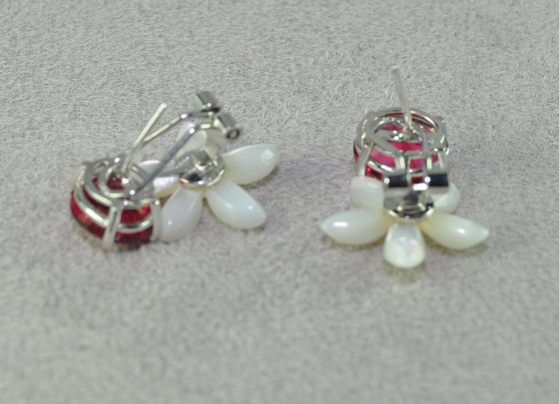 Pendiente de con flor de jazmín de nácar, engastado en plata de ley con circonita roja con un largo de 26 mm
