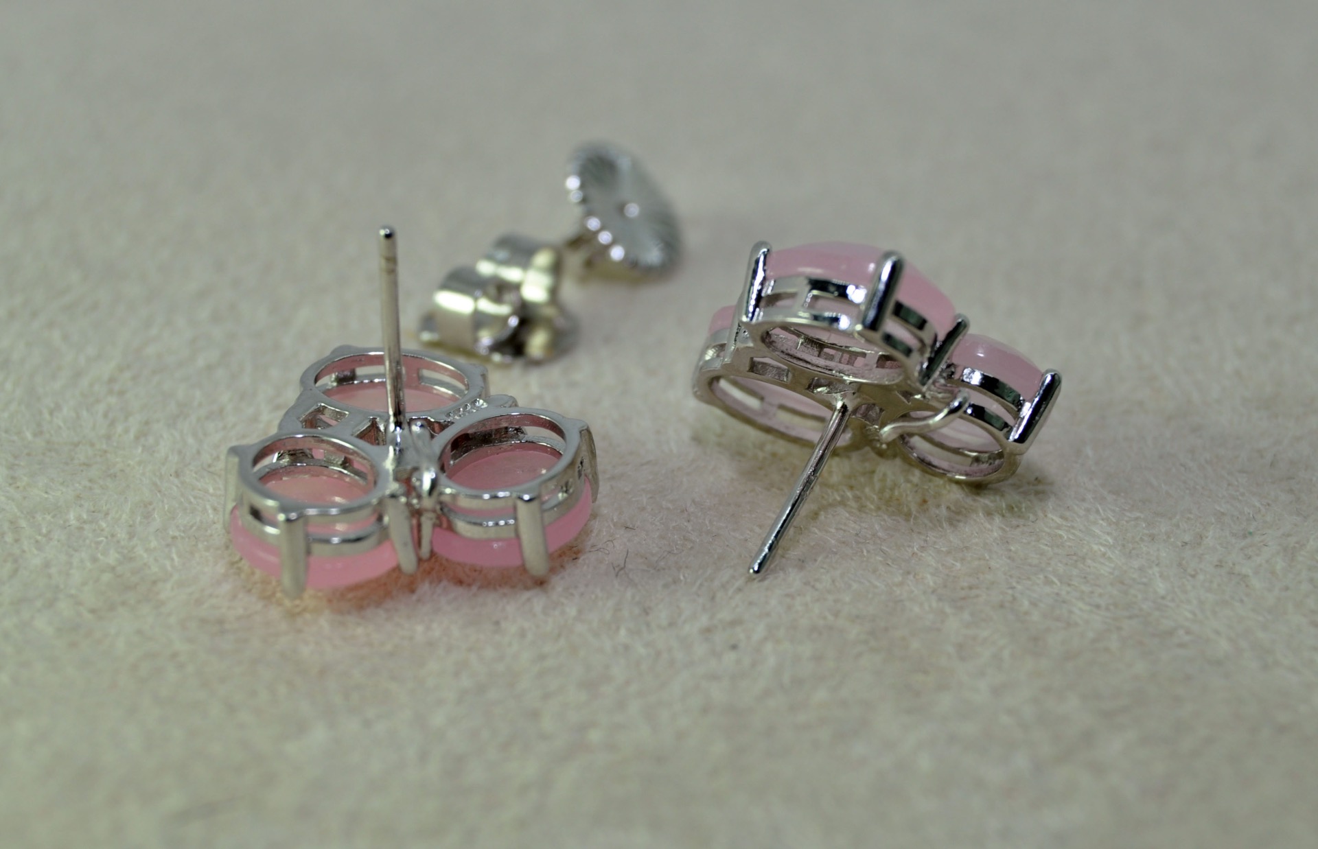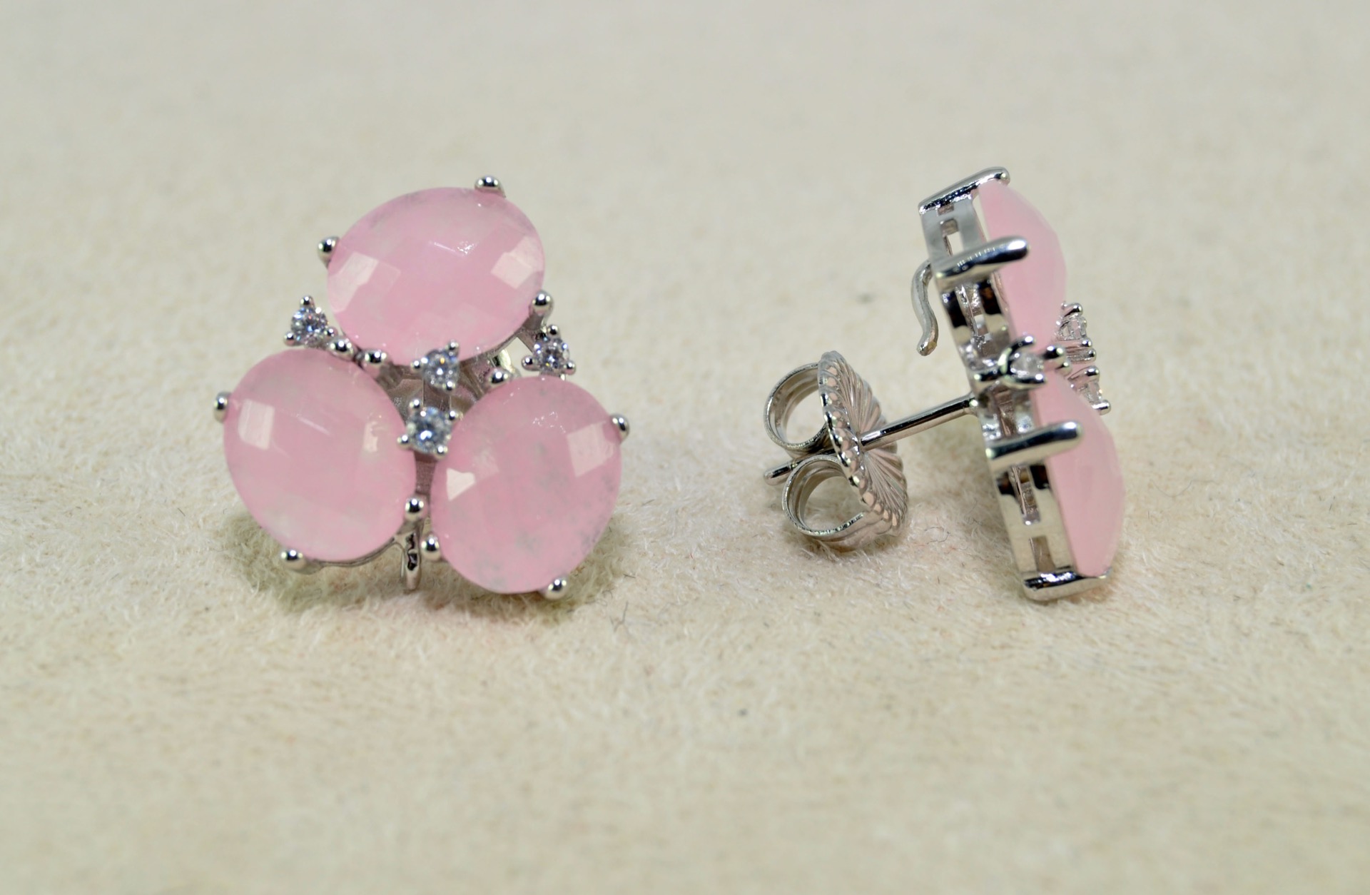 Pendiente con tres piezas de cuarzo rosa engastado en plata de ley con fornitura de ciconitas blancas y cierre a presión.