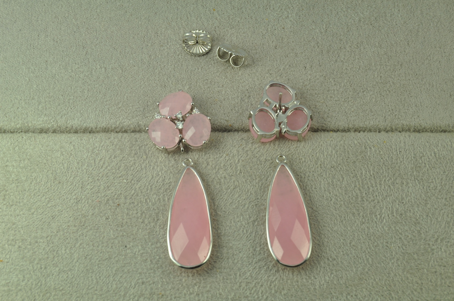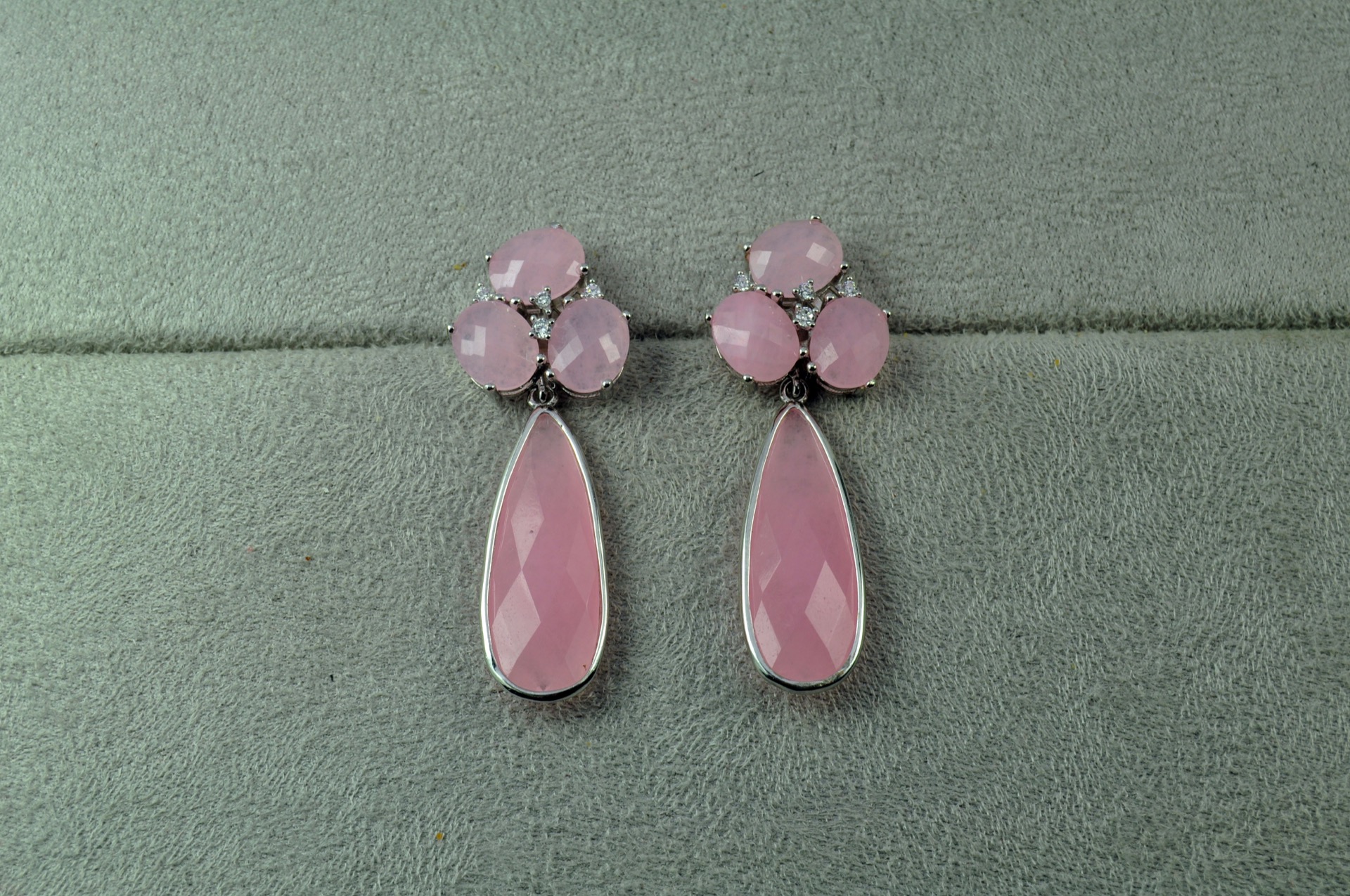 pendiente de cuarzo rosa engastado en plata de ley coronado con tres piezas de cuarzo rosa y fornitura circonita blanca con un largo 5 cm