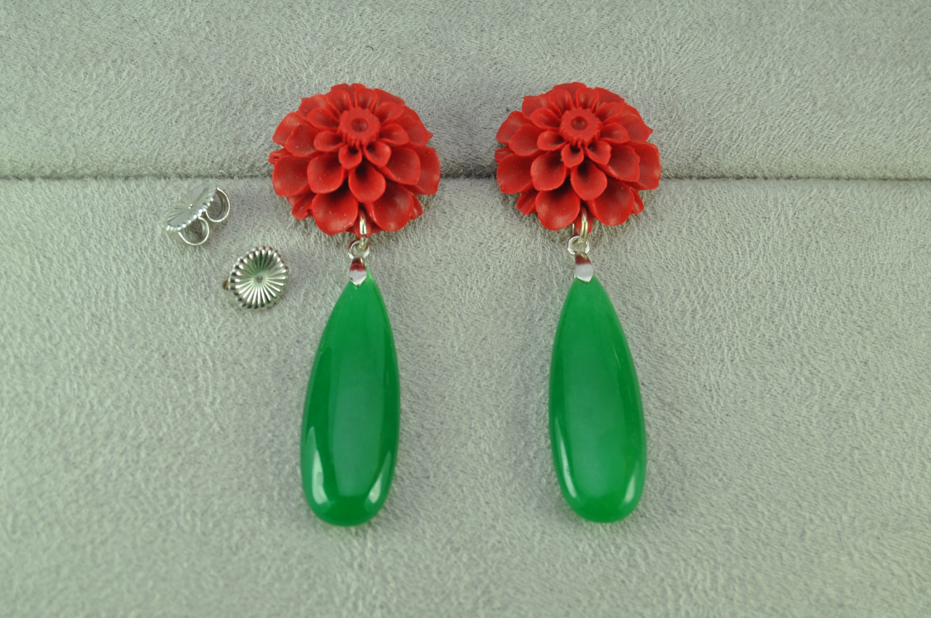 Pendiente de jade con flor de laca roja y cierre a presión con un largo de 6cm