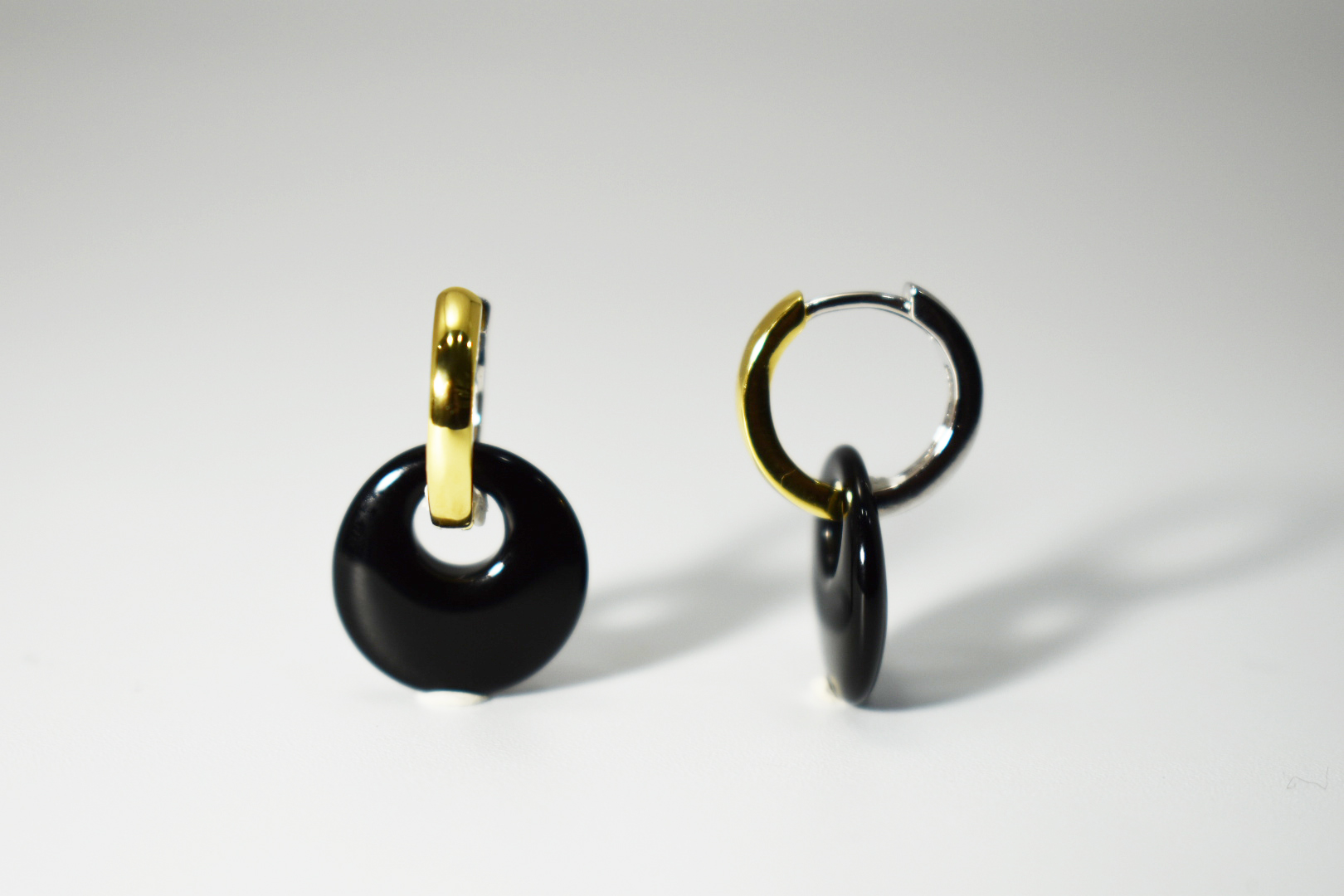 Pendiente con disco de onix y cierre de aro bicolor con un largo de 2,3cm aro bicolor 1,4cm y disco de jade 1,4cm