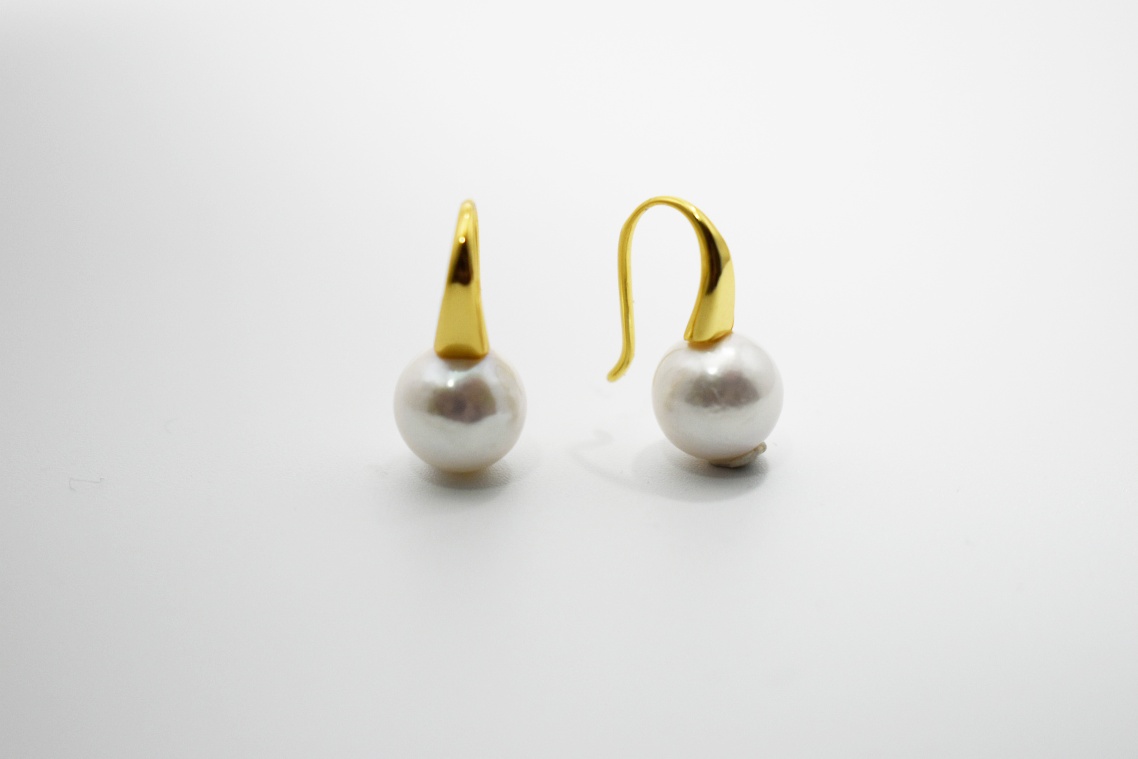 Pendiente de perla redonda con un tamaño de 10mm y un largo de 2,1cm en plata de ley con baño de oro