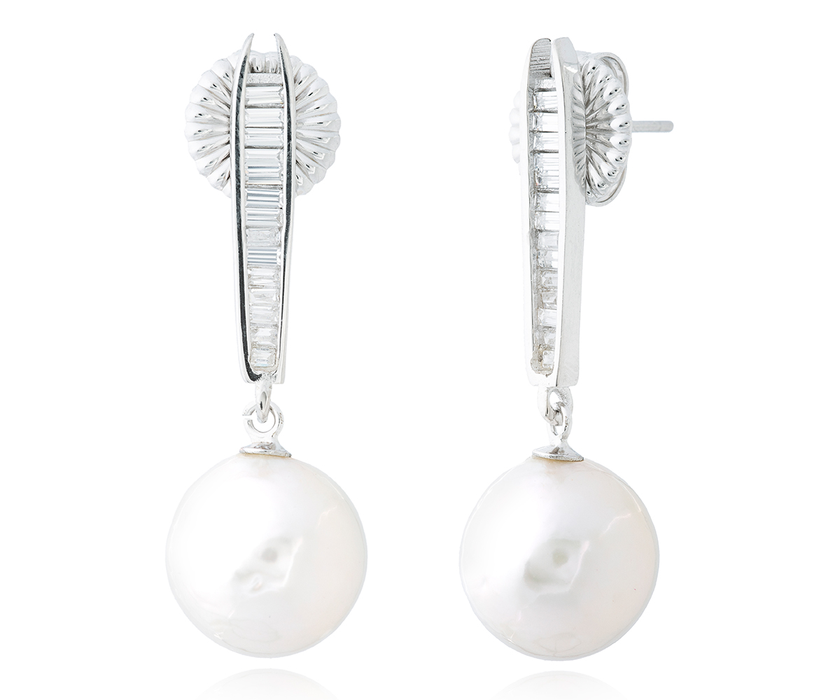Pendiente de perla blanca con un largo de 3,2 cm y incrustaciones de circonita blanca.