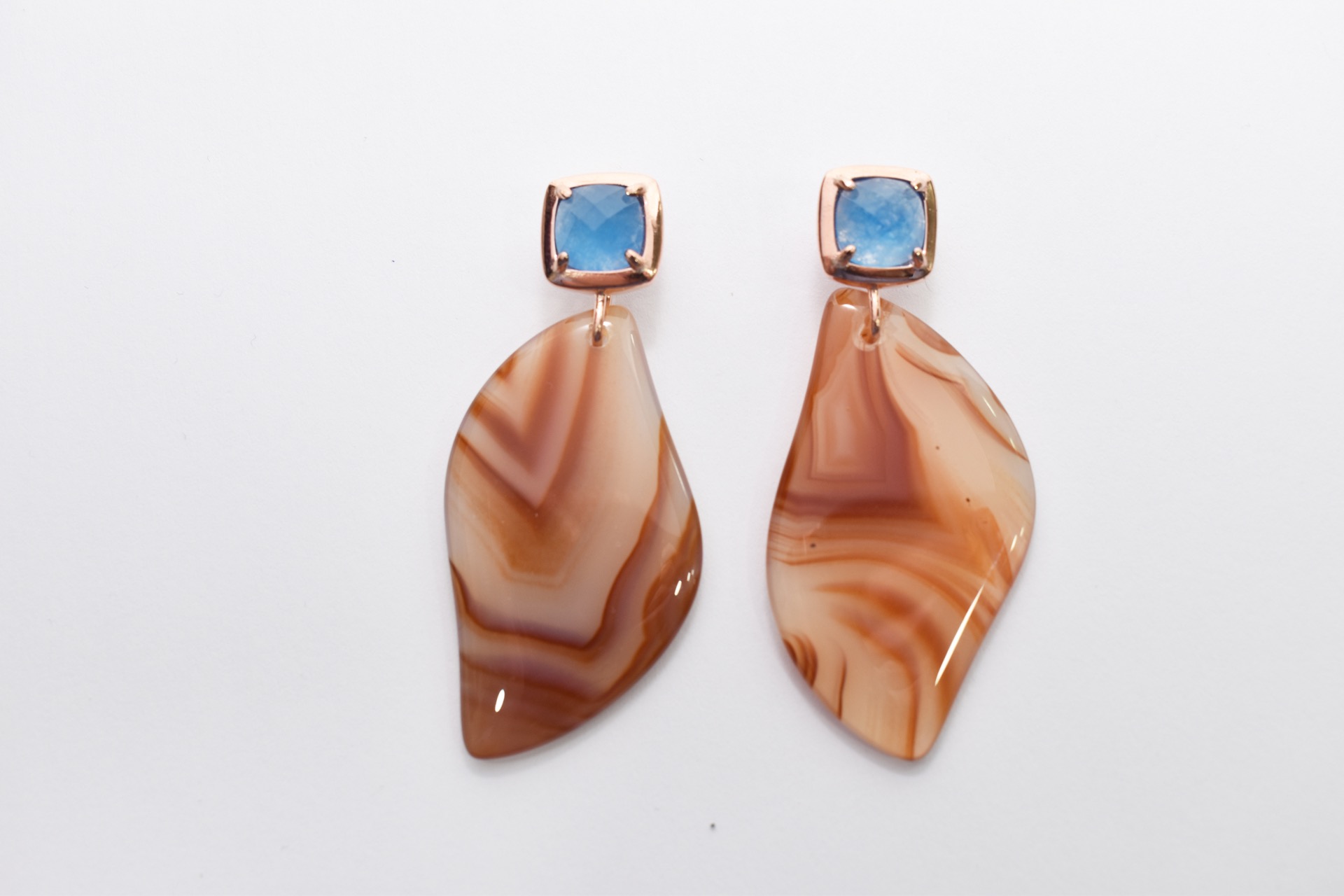 Pendiente de ágata en cuerpo ocre y coronado en tono azul engastado en plata de ley con un baño de oro dorado y cierre a presión con tuerca de 9,20mm